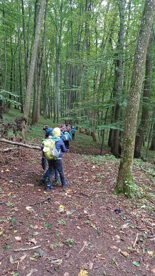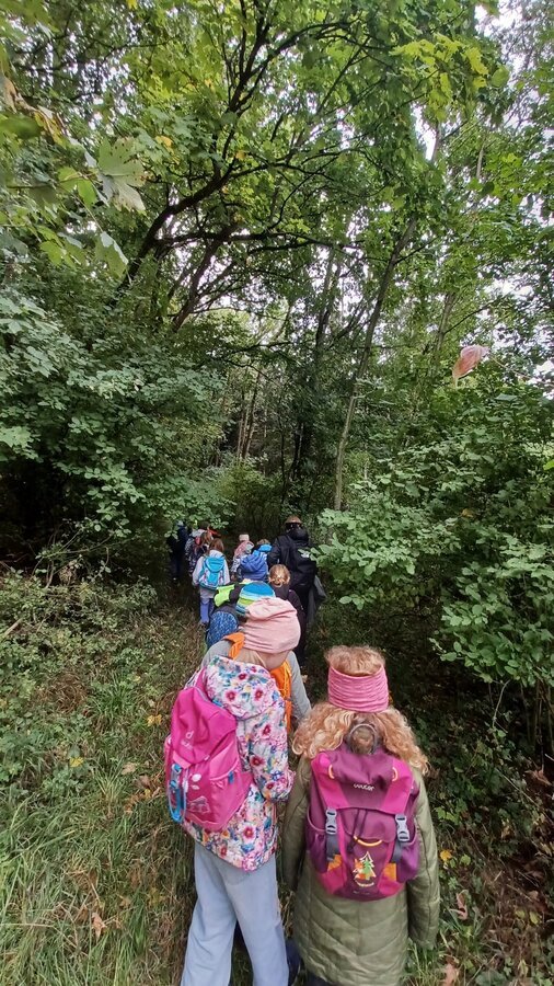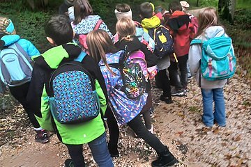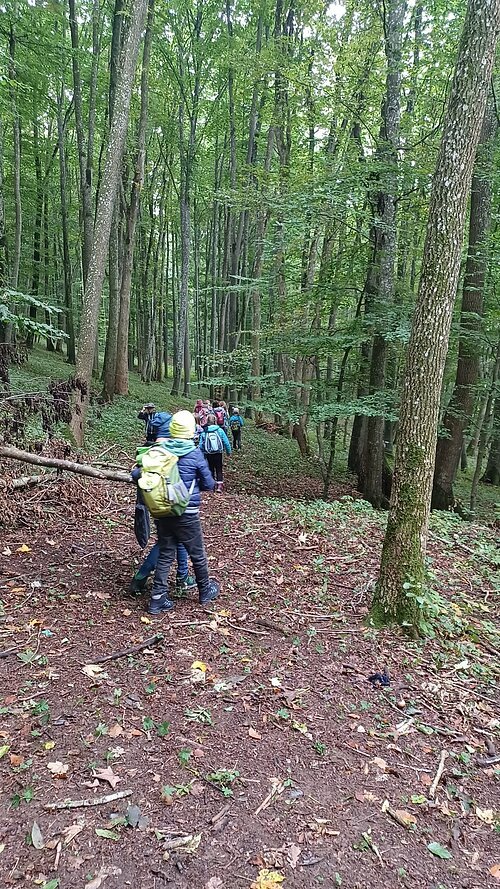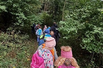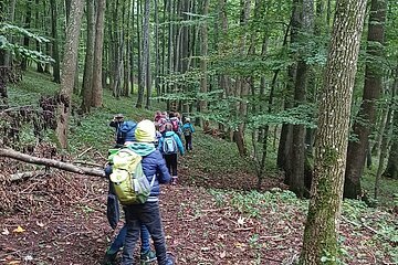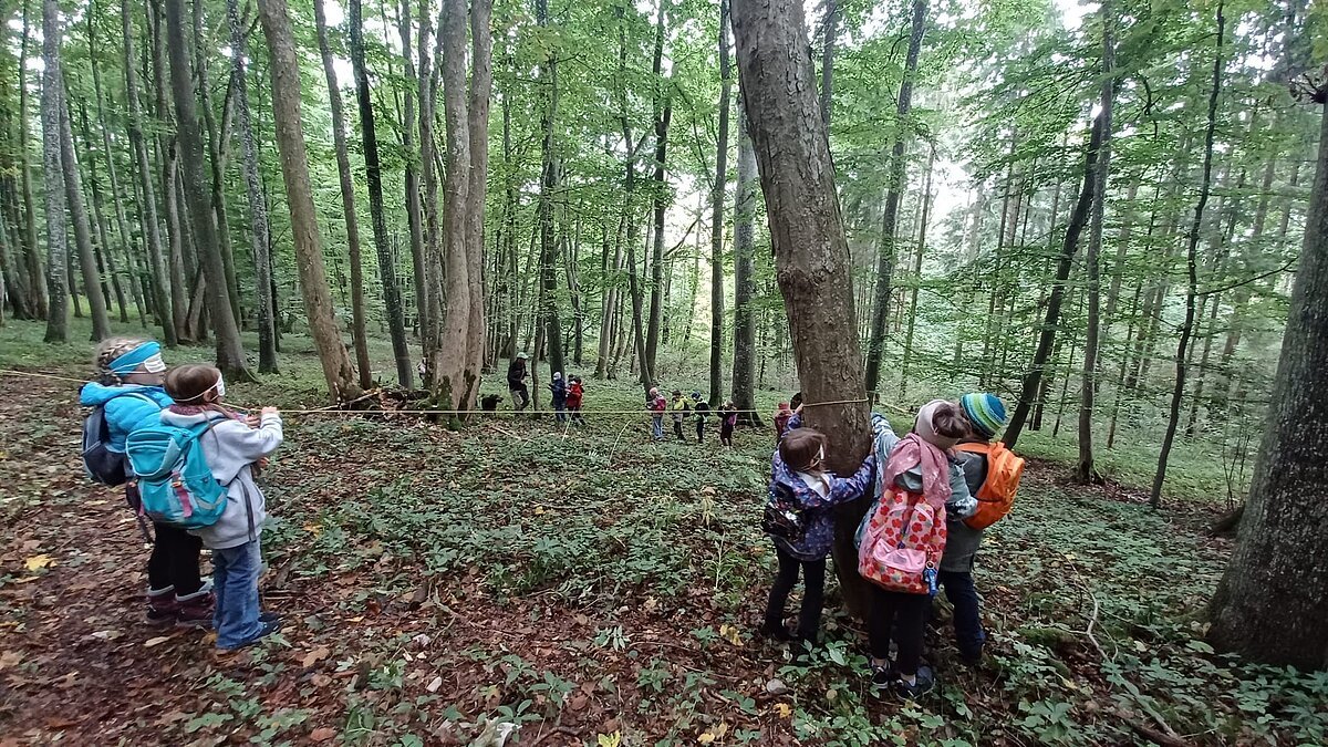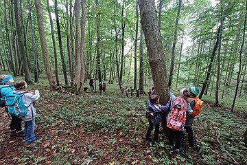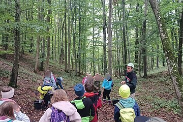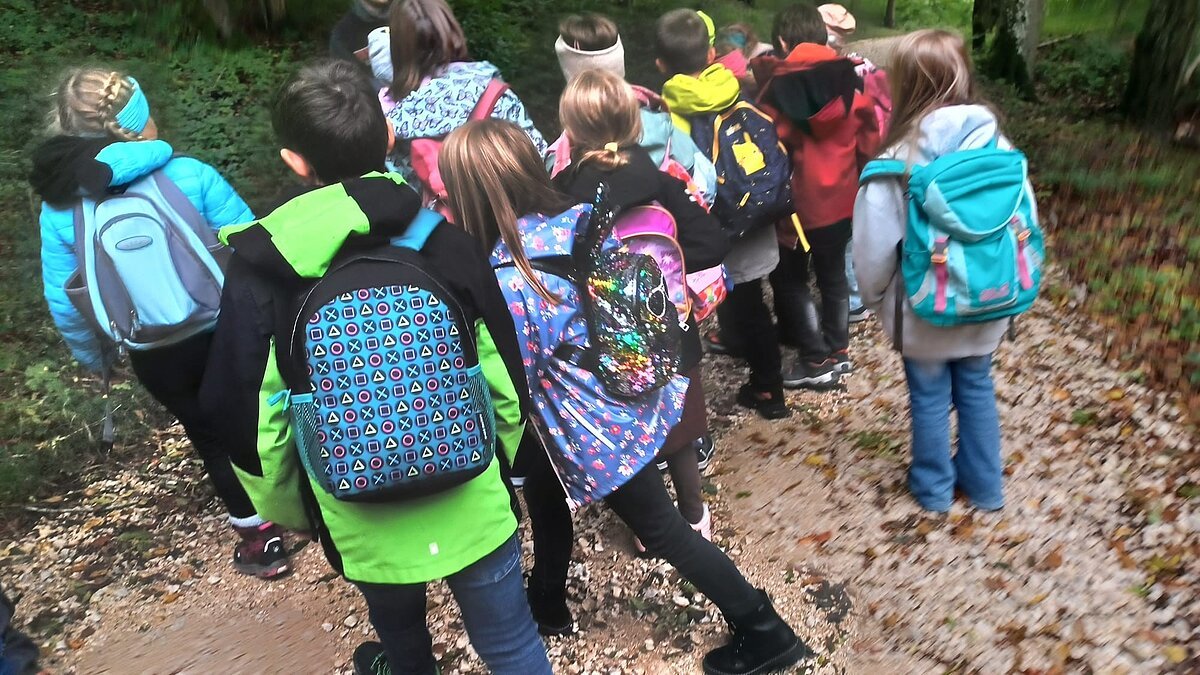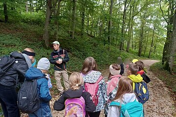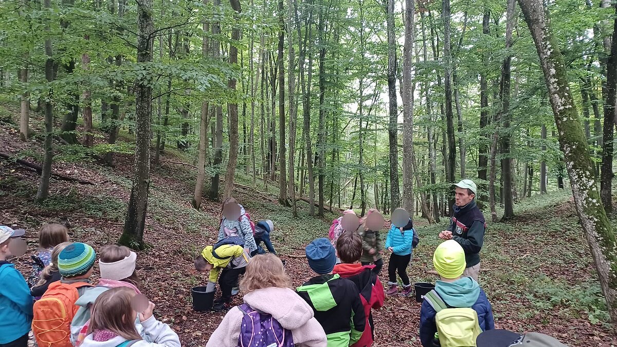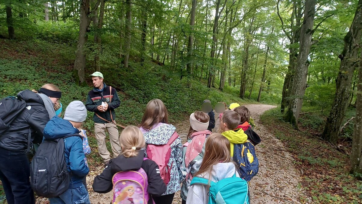 Während des Aufenthaltes im Schullandheim Heidenheim hatten die dritten Klassen die Möglichkeit, die Umgebung und den nahegelegenen Wald zu erkunden. Gemeinsam mit dem Förster Michael Kirsch, seiner Hündin Ida und zwei weiteren Kollegen starteten die Klassen ihren Aufenthalt mit einem ausgiebigen Spaziergang durch den Forst. Nach einem kleinen Spiel zu Beginn, bei dem die Schüler:innen Waldtiere nach dem Wer-bin-ich-Prinzip erraten sollten, ging es tiefer in den Wald hinein. Mit einer Augenbinde am Kopf, geführt von einer Schnur, die sich durch die Bäume schlängelte, sollten die Kinder verschiedene Gegenstände erkennen und anschließend äußern, ob diese in den Wald gehören würden – von Taschentüchern, bis Fichtenzapfen war einiges dabei. Besonders beeindruckend war der partnerschaftliche Gang mit dem Spiegel durch den Wald. Dadurch konnten die Schüler:innen den Wald und den Himmel aus der Perspektive der Insekten nachvollziehen. Nach einem kurzen Fußmarsch und einer kleinen Brotzeit wurde noch ein letztes Spiel gespielt. Mit verschiedenen Eimern sollten die drei Parteien Mensch, Wald und Natur dargestellt werden. Die Kinder sollten nun gegenseitig immer Hölzchen aus den anderen Eimern nehmen. Mit dieser Veranschaulichung konnte die Wichtigkeit des Gleichgewichtes und der Achtsamkeit mit den natürlichen Rohstoffen gut verdeutlicht werden.