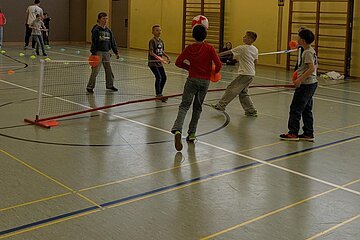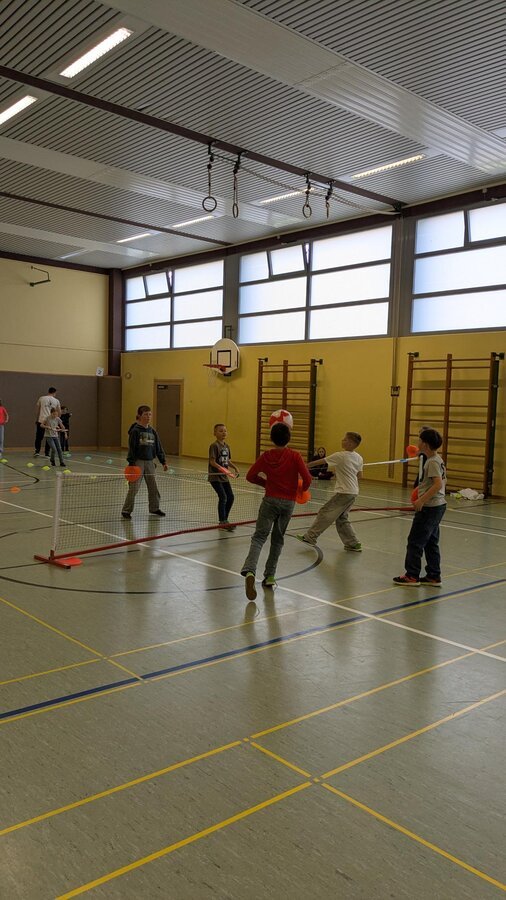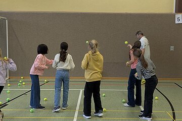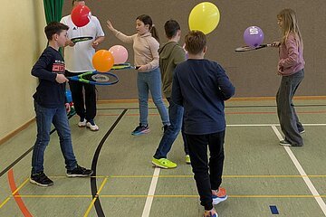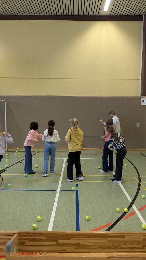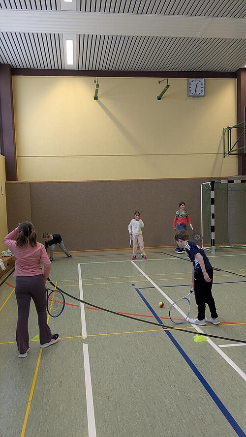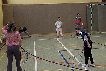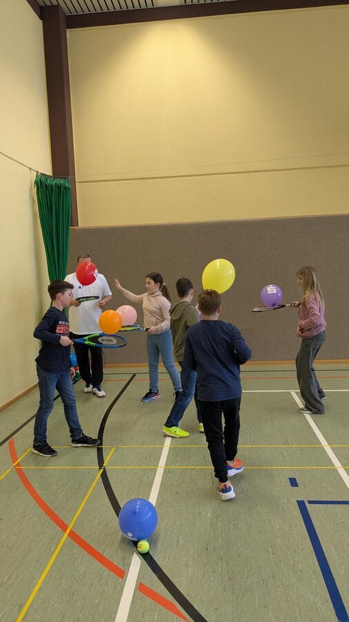 Am 23.03.2026 kam der TC Nennslingen zu uns in die Schule, um den Kindern der 2. - 4. Klassen die Sportart Tennis näherzubringen. An fünf Stationen konnten die Schülerinnen und Schüler erste Erfahrungen mit Tennisbällen und -schlägern sammeln. Lustige Spiele wie die Tennisschlägerstaffel mit einem Luftballon oder ein kleiner Rundlauf mit einem Wasserball über das Tennisnetz machten allen Kindern großen Spaß und so war es eine gelungene Sportstunde für alle Beteiligten, die sicherlich einigen Kindern die doch eher schulfremde Sportart Tennis nähergebracht hat.