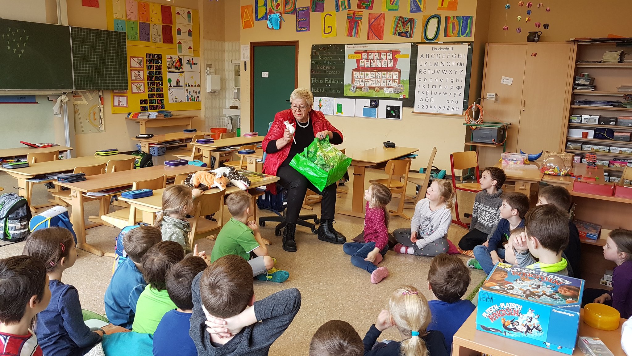 Sie hat ein großes Buch dabei gehabt. Das war der „Grüffelo“. Und in einer Tüte waren ganz viele Stofftiere. Sie kommen alle in dem Buch vor: Ein Fuchs, eine Maus, eine Schlange…und natürlich der Grüffelo.