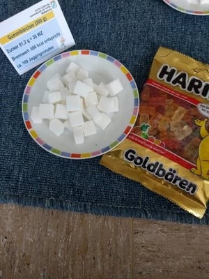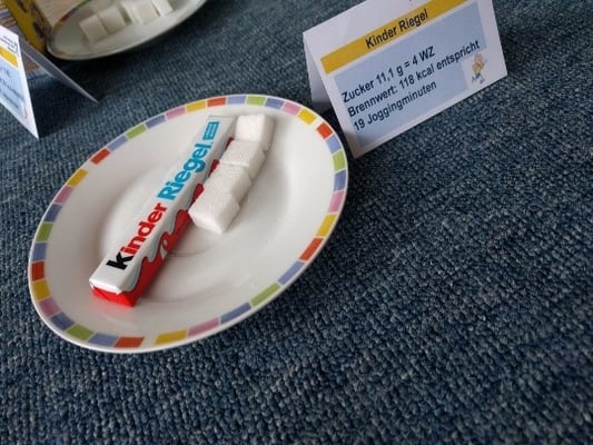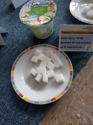 Dem Zucker auf der Spur war man in der Klasse 1b. Zusammen mit Elias Kamm und der Klassenlehrerin Frau Kamm konnten sich die Besucher über den Zuckergehalt von verschiedenen Lebensmitteln informieren. Sowohl die Kinder als auch die Erwachsenen staunten nicht schlecht, wie viel Zucker z.B. in einem Fruchtjoghurt, Schokolade, Limonade oder Gummibärchen steckt. Hätten Sie gedacht, dass z. B. in einem Fruchtjoghurt 16 Stück Würfelzucker stecken?