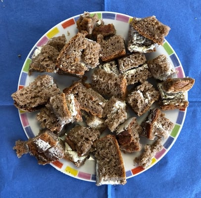 Um der ersten Frage auf den Grund zu gehen, lud die Klasse 3b zur Brotverkostung in ihr Klassenzimmer ein. Fleißig hatten die Kinder kleine Brotschnitten mit Frischkäse bestrichen. So konnten die Besucher das unterschiedliche Brot probieren und ihren Geschmack entscheiden lassen.