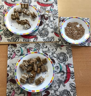 Die Antwort auf die zweite Frage konnten sich die Kinder erschließen, indem sie Weißmehl, welches nur den Mehlkörper des Getreides enthält, mit Vollkornmehl, für welches das ganze Korn gemahlen wird, verglichen. Die gesundheitlichen Vorteile von Vollkornbrot wurden dabei bewusst gemacht.