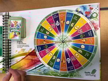 Im enthaltenen Spiel gilt es zum einen das erlernte Wissen bei Quizfragen anzuwenden und zum anderen bei Aktionskarten Geschicklichkeit und Koordination unter Beweis zu stellen. Durch das Buch und auch das Spiel führen lustige Ernährungshelden wie Kalle Kartoffel, Olli Olive oder Hotte Karotte, die den Kindern spielerisch und einprägsam die verschiedenen Nährstoffe näherbringen. Die Kinder der Klasse 4a agierten als Spielleiter für jeweils 2-4 Spieler.