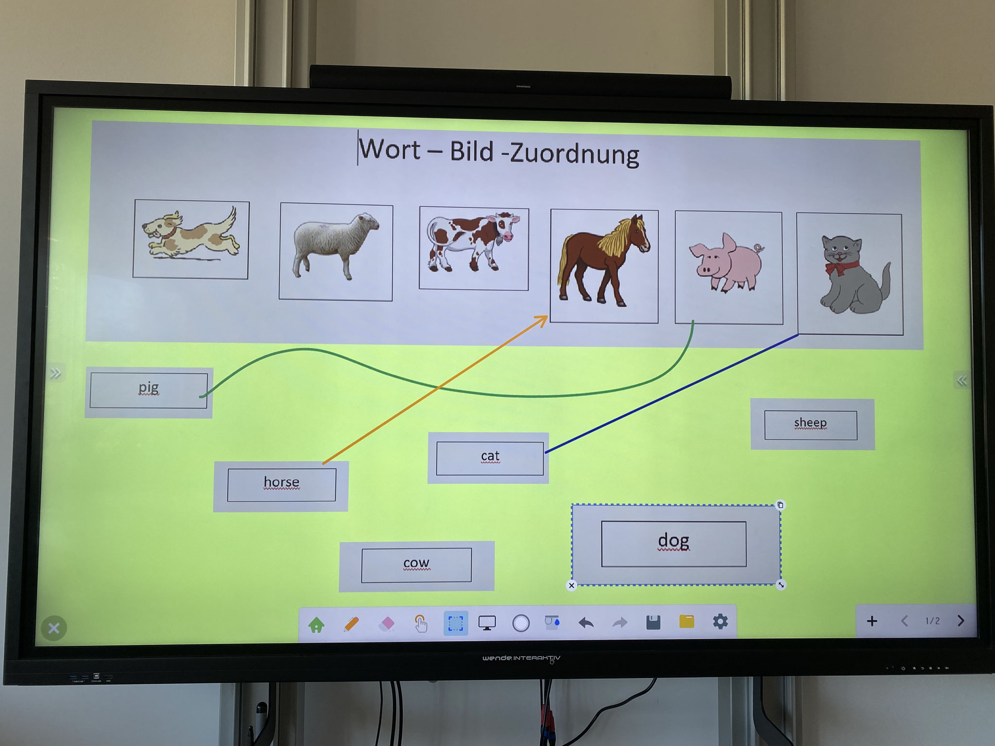 Zudem können wir unsere Tafel auch für Hörverstehens-Übungen nutzen. Nachdem eine Audiodatei an der Tafel abgespielt wurde, kann das Gesprochene mit dem richtigen Wort oder Bild zusammengefügt werden.