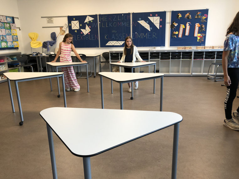 Als erstes zeigten die Viertklässler, wie die Einzeltische, die bei Proben oder für Einzelarbeiten, bei denen man sich konzentrieren muss, benötigt werden, gestellt werden können. Danach präsentierten sie die Partnertische, die ganz schnell zu Dreiertischen umgebildet werden können. Neben den Dreiertischen sind auch Vierertische möglich, bei denen sich alle anschauen und gut zusammenarbeiten können. Ebenso veranschaulichten die Kinder, wie große Sechsertisch gebildet werden. Wenn hier die mittleren Tische noch gedreht werden, können nochmals Tische eingeschoben werden und so sogar sieben bzw. acht Kinder an diesem Tisch Platz nehmen. Zum Abschluss zeigten die Viertklässler noch, dass auch eine lange Reihe problemlos möglich ist.