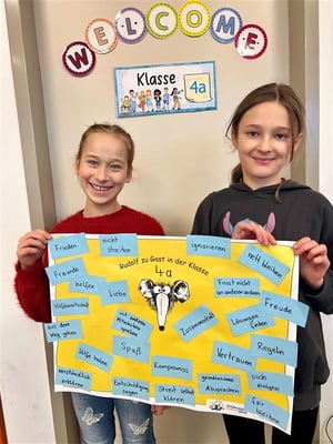 Zu Beginn lernten die Kinder das Maskottchen „Ratte Rudolf“ kennen. Da der kleine Nager bislang noch nie eine Schule besucht hatte und meist allein unterwegs war, sollten die Kinder ihm erklären, wie eine Gemeinschaft funktioniert. Gemeinsam sammelten sie wichtige Werte, die für ein harmonisches Miteinander entscheidend sind. Ihre Ergebnisse hielten sie stolz auf einem Plakat fest.